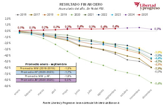 En el gráfico se puede observar el desempeño financiero mensual acumulado entre 2017 y 2025. Sólo 2024 y 2025 exhiben superávit financiero al mes de septiembre, cuando vemos que entre 2017 y 2023 siempre la regla fue tener un déficit fiscal creciente mes a mes.
