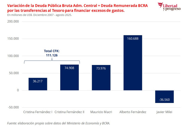 Por ejemplo, el primer gobierno de Cristina Fernández de Kirchner incrementó la deuda en U$S 36.217 Millones, mientras que en su segundo mandato lo hizo por U$S 74.908 Millones. De esta manera, entre sus dos gestiones incrementó la deuda bruta en U$S 111.126 Millones. En cuanto a la gestión de Mauricio Macri, el incremento de la deuda bruta fue por U$S 73.976 Millones. Luego, el gobierno de Alberto Fernández lo hizo por U$S 160.688 Millones. Finalmente, el actual gobierno (hasta la fecha) ha logrado reducir la deuda en U$S 36.560 Millones, contabilizando la deuda remunerada que los gobiernos anteriores obligaron al BCRA a tomar para financiar sus excesos de gasto.