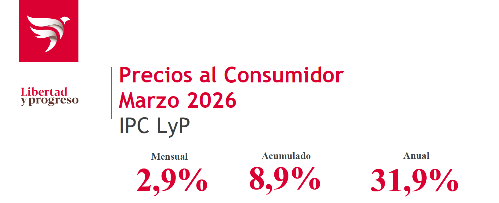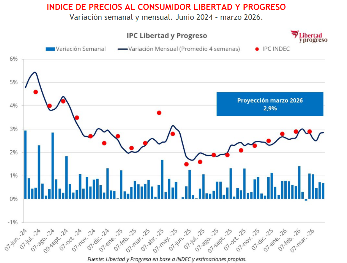 Julián Neufeld, Economista de la Fundación Libertad y Progreso, sostiene que "En marzo, el IPC LyP registró un incremento del 2,9% mensual, lo que marcaría un resultado idéntico al de los dos meses anteriores y constituiría una inflación que no baja desde mayo del año pasado. En un contexto de mayor estabilidad del peso desde noviembre, la mayor parte de los bienes y servicios ya había absorbido el impacto de la depreciación previa a las elecciones, de modo que el efecto rezagado sobre los precios se iba agotando. A medida que ese efecto fue perdiendo intensidad, el IPC comenzó a desacelerarse. En línea con esto las mediciones preliminares para las primeras dos semanas se ubicaban en torno al 2,6%. Sin embargo, hacia la tercera semana la proyección para marzo se corrigió al alza hasta el 2,8% y terminó trepando a 2,9% en los últimos días del mes. El principal factor detrás de este cambio fue el efecto del conflicto en Medio Oriente sobre los precios de los combustibles, que registraron un aumento de alrededor del 6% en la última semana. De cara a abril, el principal riesgo pasa por la velocidad con que el pass-through de combustibles se traslade a la canasta general vía costos de transporte."