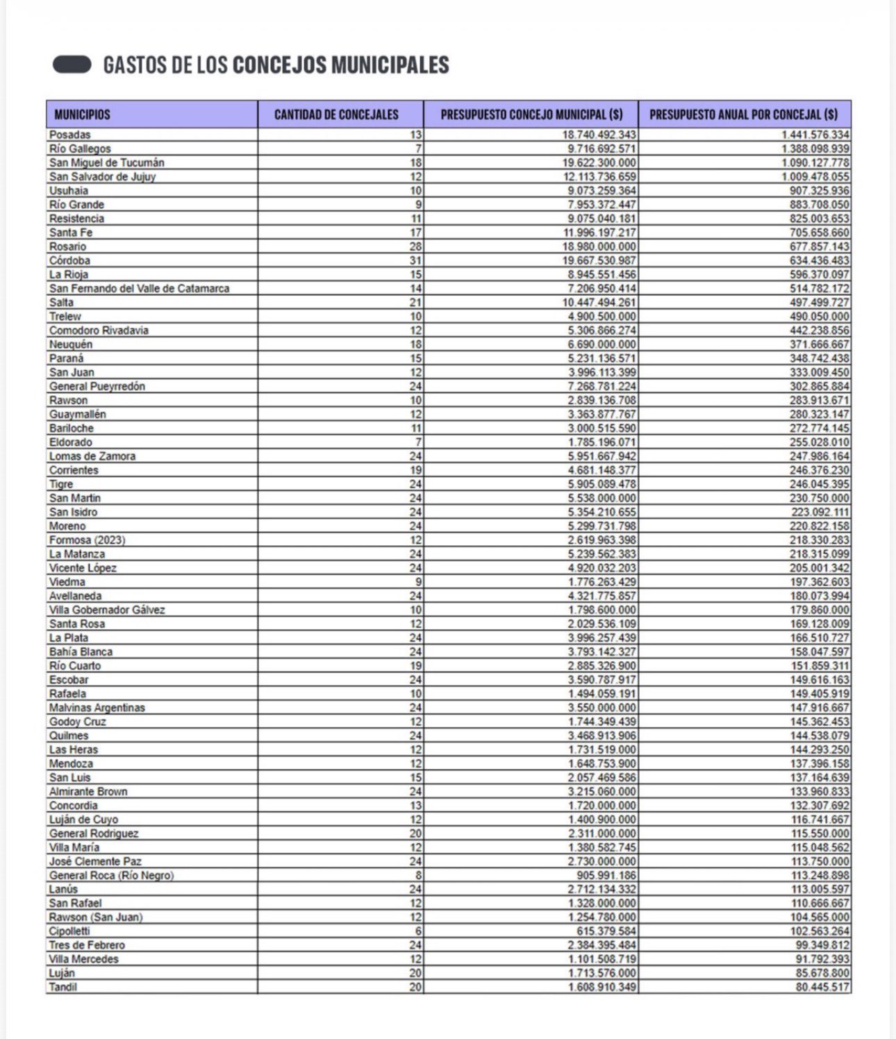 MISIONERO Un reciente informe elaborado por la Fundación Libertad y Progreso encendió la polémica al revelar el alto costo de los Concejos Deliberantes municipales en la Argentina. El dato más contundente tiene como protagonista a Posadas, que aparece primera en el ranking nacional de gasto por concejal.